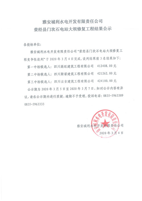 滎經(jīng)縣門坎石電站大壩修復(fù)工程結(jié)果公示