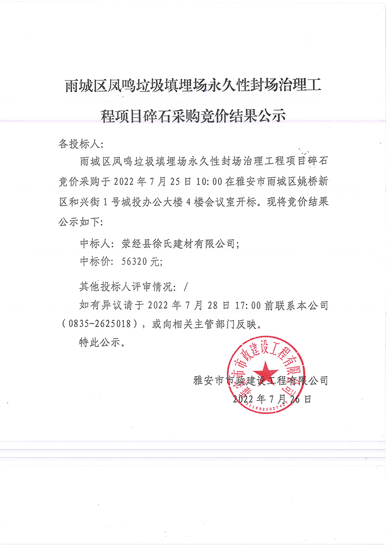 雨城區(qū)鳳鳴垃圾填埋場永久性封場治理工程項(xiàng)目碎石采購競價(jià)結(jié)果公示