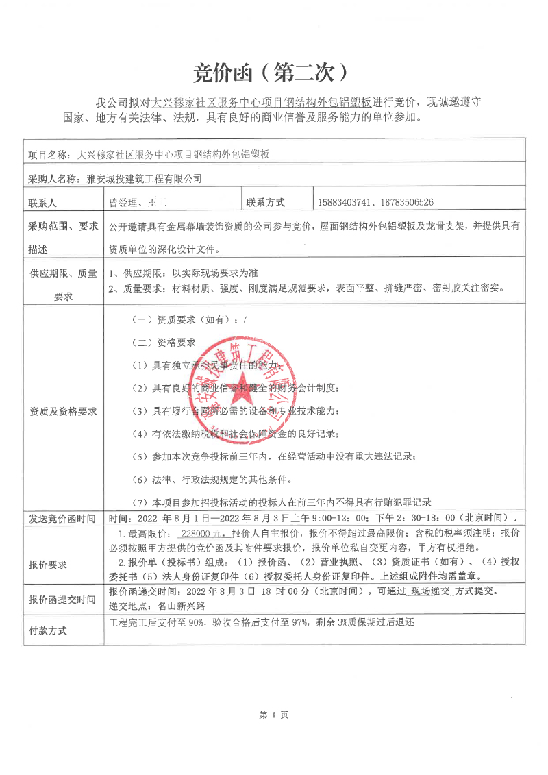 大興穆家社區(qū)服務(wù)中心項(xiàng)目鋼結(jié)構(gòu)外包鋁塑板競(jìng)價(jià)公告(第二次)