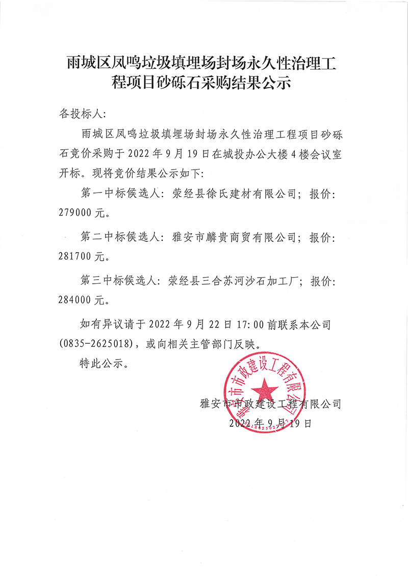 雨城區(qū)鳳鳴垃圾填埋場永久性封場治理工程項(xiàng)目砂礫石采購結(jié)果公示