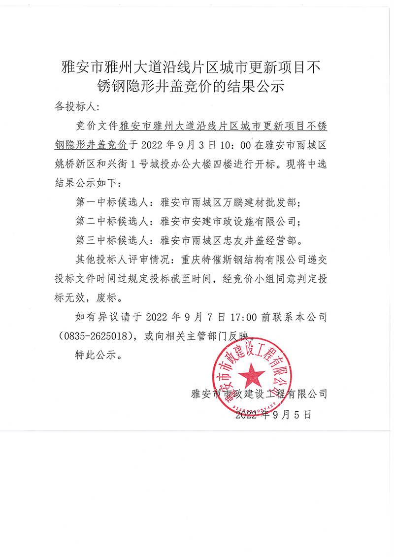 雅安市雅州大道沿線片區(qū)城市更新項(xiàng)目不銹鋼隱形井蓋競價(jià)招采競價(jià)的結(jié)果公示