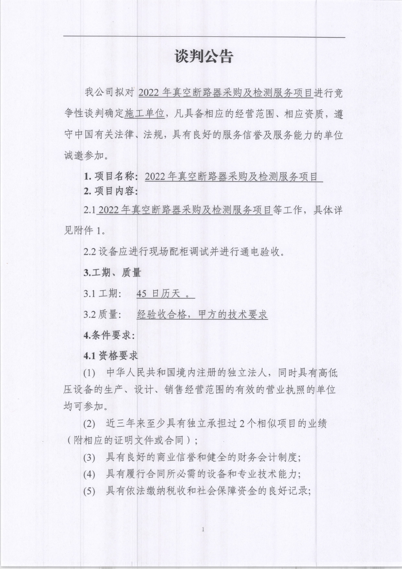 城利水電公司2022年真空斷路器采購及檢測服務(wù)項(xiàng)目競爭性談判公告