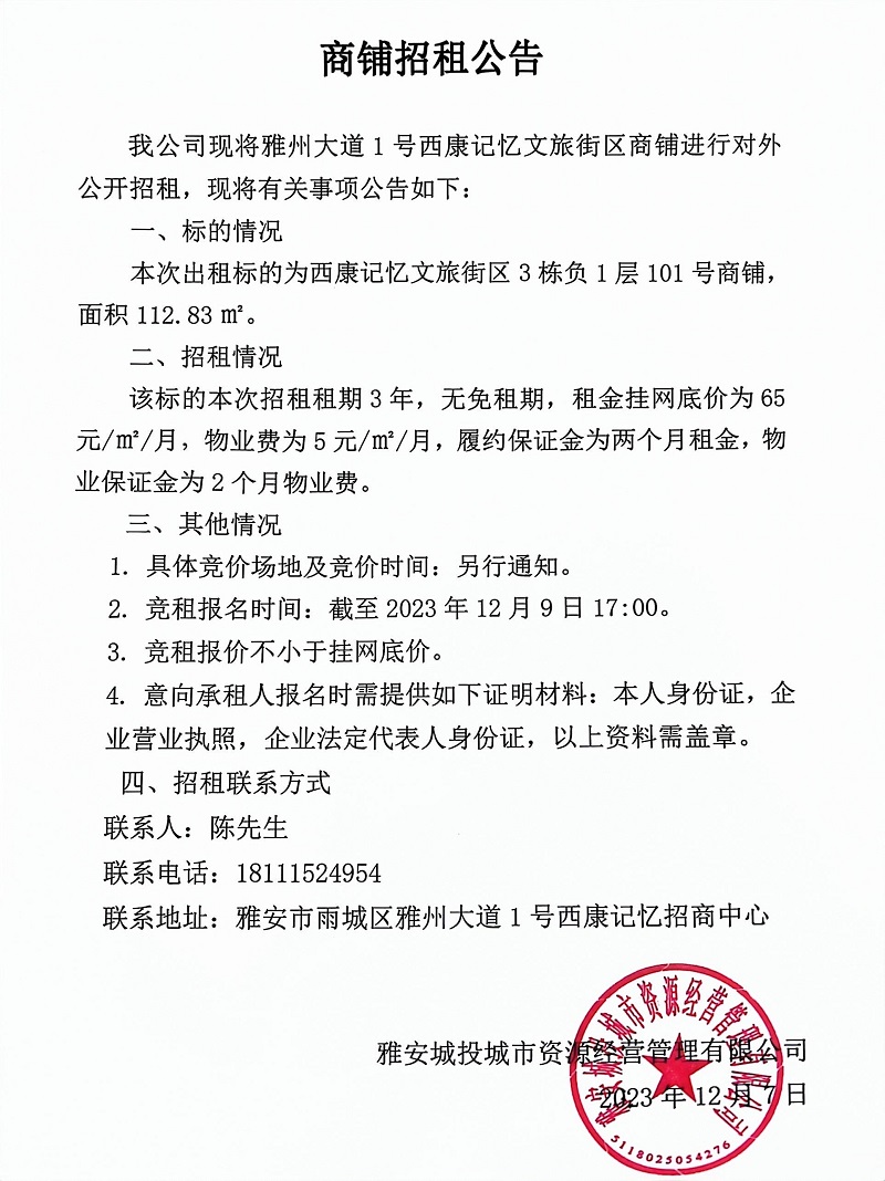 雅州大道1號(hào)西康記憶文旅街區(qū)3棟負(fù)1層101號(hào)商鋪招租公告