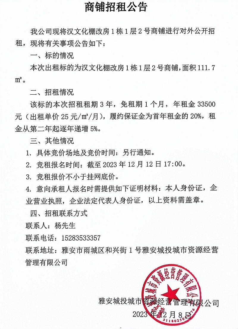 漢文化棚改房1棟1層2號(hào)商鋪招租公告