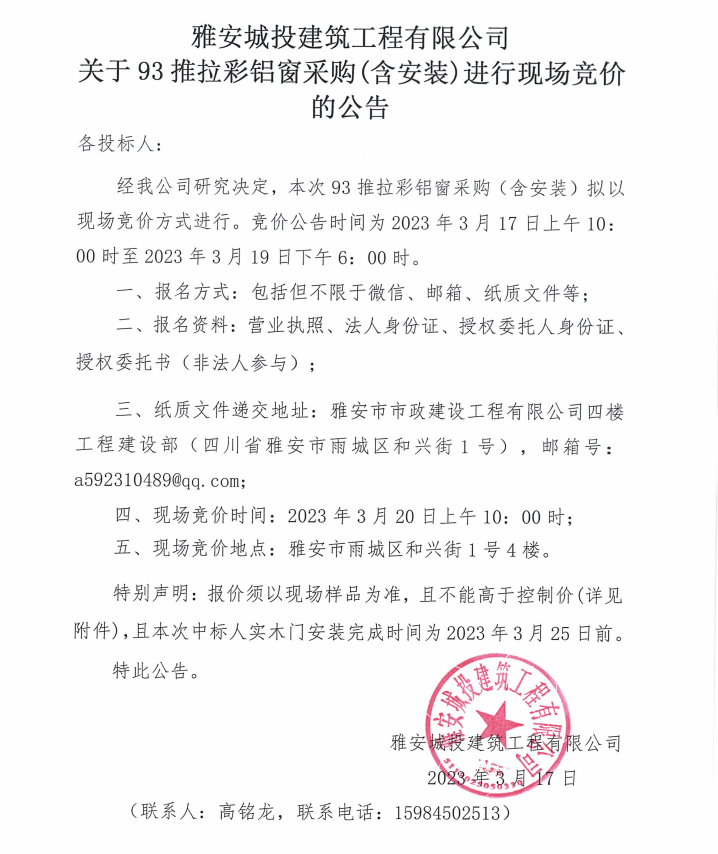 雅安城投建筑工程有限公司關于93推拉彩鋁窗采購(含安裝)進行現(xiàn)場競價的公告