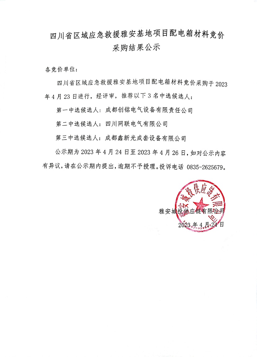 四川省區(qū)域應(yīng)急救援雅安基地項(xiàng)目配電箱材料競價采購結(jié)果公示