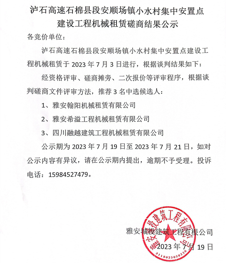 瀘石高速石棉縣段安順場(chǎng)鎮(zhèn)小水村集中安置點(diǎn)建設(shè)工程機(jī)械租賃談判磋商結(jié)果公示