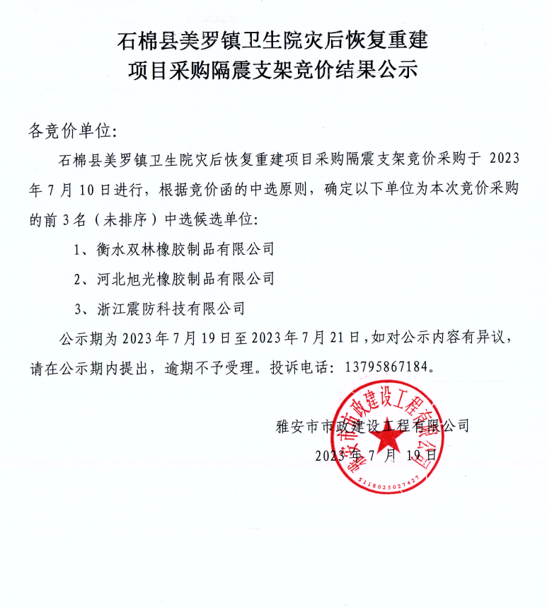石棉縣美羅鎮(zhèn)衛(wèi)生院災后恢復重建項目采購隔震支架競價結(jié)果公示