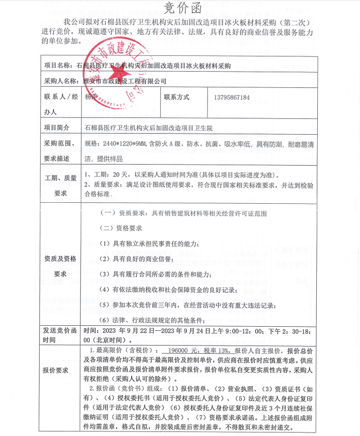 石棉縣醫(yī)療衛(wèi)生機(jī)構(gòu)災(zāi)后加固改造項(xiàng)目冰火板材料采購(gòu)(第二次)競(jìng)價(jià)公告