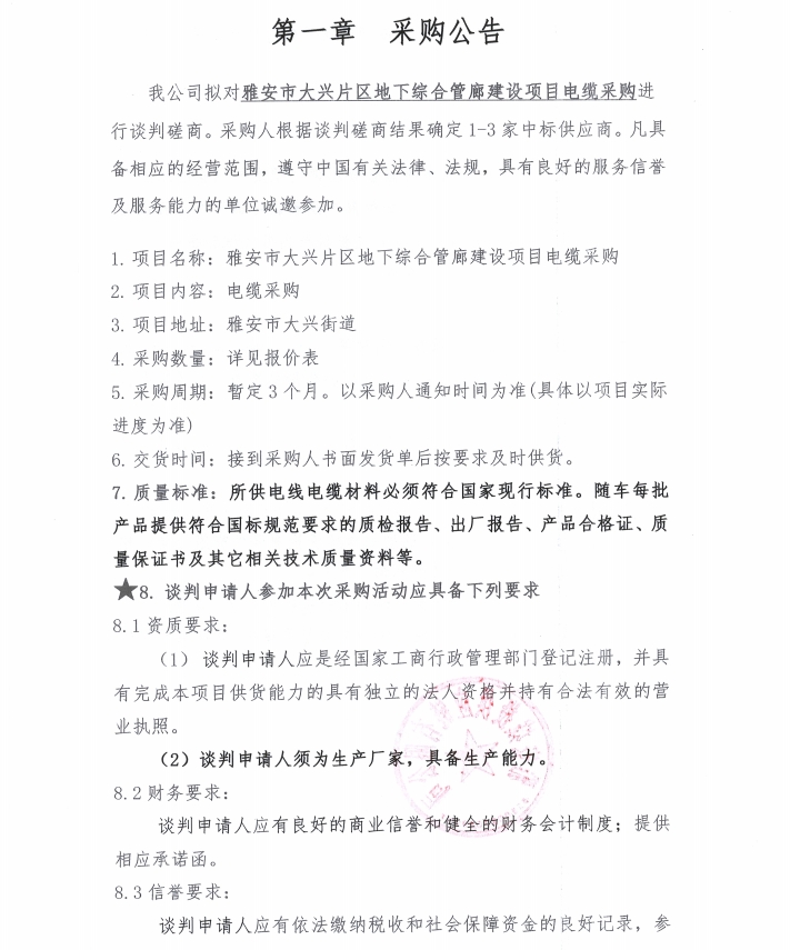 雅安市大興片區(qū)地下綜合管廊建設(shè)項目電纜采購公告