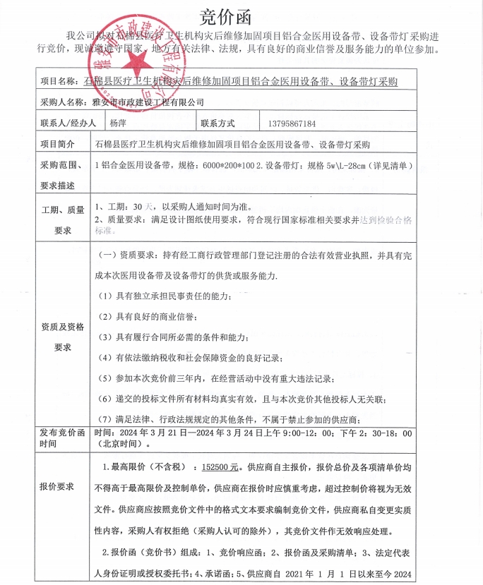 石棉縣醫(yī)療衛(wèi)生機構(gòu)災(zāi)后維修加固項目鋁合金醫(yī)用設(shè)備帶、設(shè)備帶燈采購競價公告
