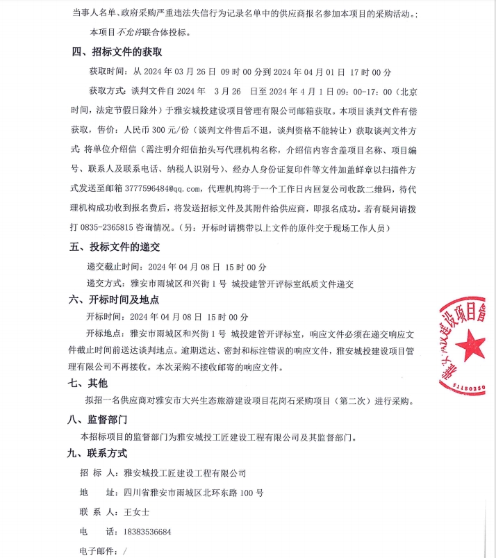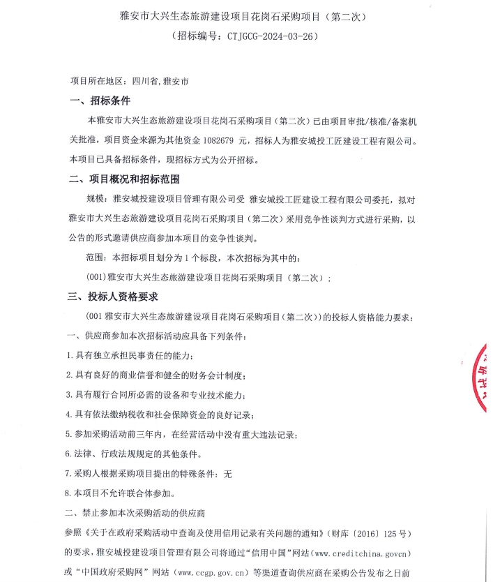 雅安市大興生態(tài)旅游建設(shè)項目花崗石采購項目(第二次)公告
