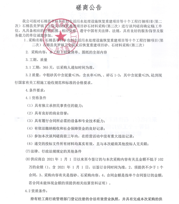 石棉縣草科鄉(xiāng)農村生活污水處理設施恢復重建項目等十個工程打捆項目(第二次)、石棉縣美羅鎮(zhèn)衛(wèi)生院災后恢復重建項目砂石材料采購(第三次)磋商公告