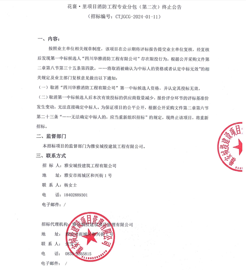 花襄·里項(xiàng)目消防工程專(zhuān)業(yè)分包(第二次)終止公告