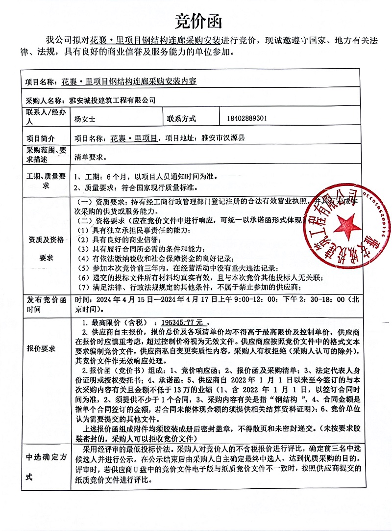 花襄·里項目鋼結構連廊采購安裝競價公告