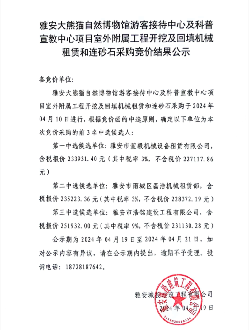 雅安大熊貓自然博物館游客接待中心及科普宣教中心項目室外附屬工程開挖及回填機(jī)械租賃和連砂石采購競價結(jié)果公示