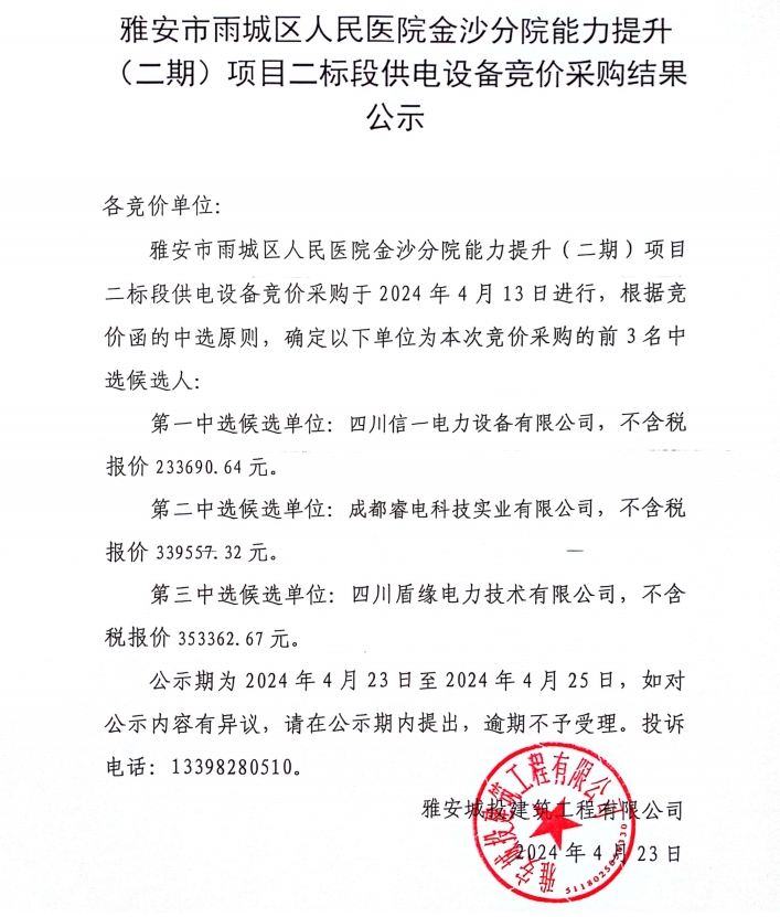 雅安市雨城區(qū)人民醫(yī)院金沙分院能力提升(二期)項目二標(biāo)段供電設(shè)備競價采購結(jié)果公示