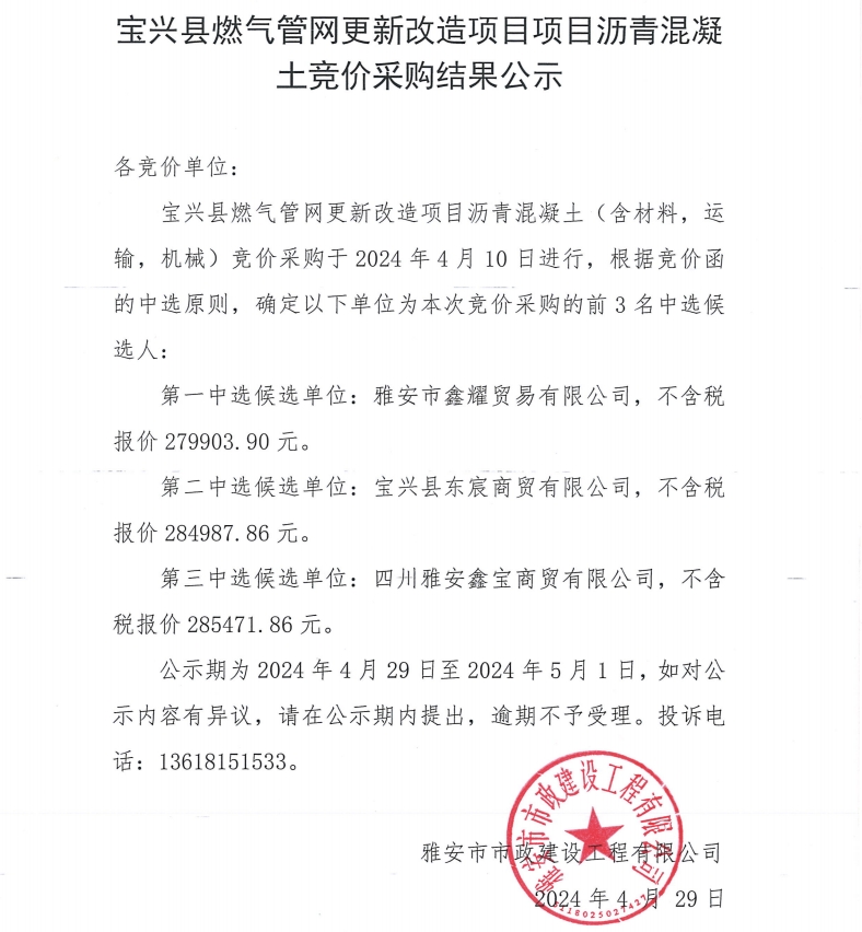 寶興縣燃氣管網(wǎng)更新改造項目瀝青混凝土競價采購結(jié)果公示