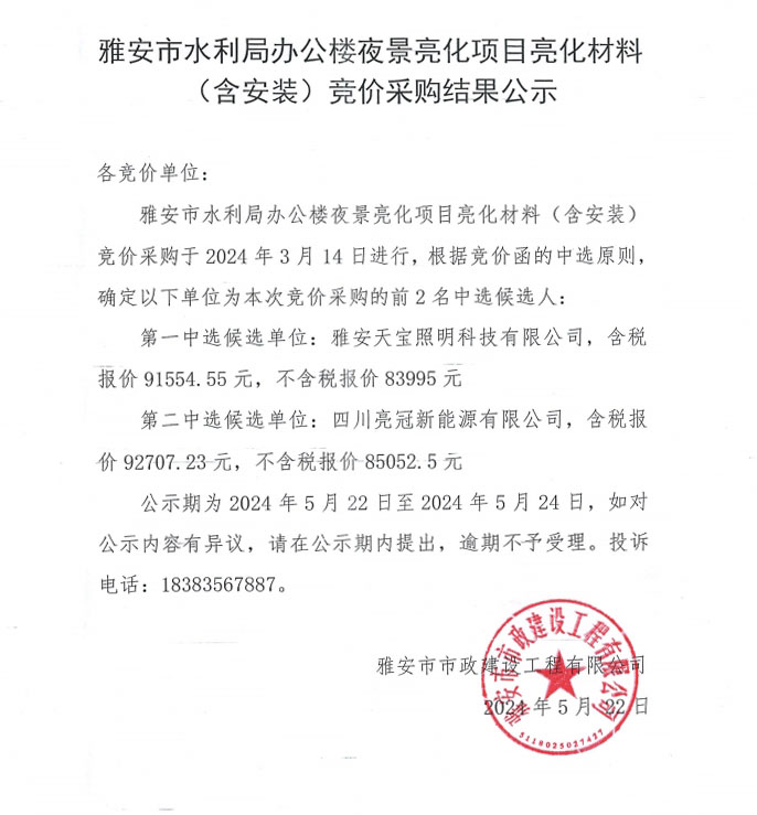 雅安市水利局辦公樓夜景亮化項目亮化材料(含安裝)競價采購結果公示