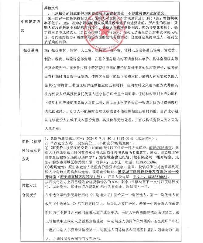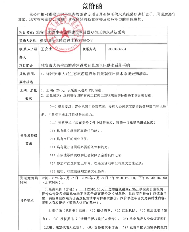 雅安市大興生態(tài)旅游建設項目景觀恒壓供水系統(tǒng)采購競價公告