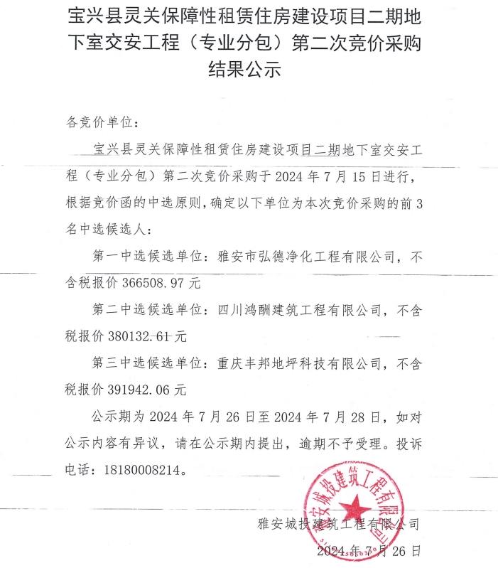 寶興縣靈關(guān)保障性租賃住房建設(shè)(二期)地下交安工程(專業(yè)分包)第二次競價采購結(jié)果公示
