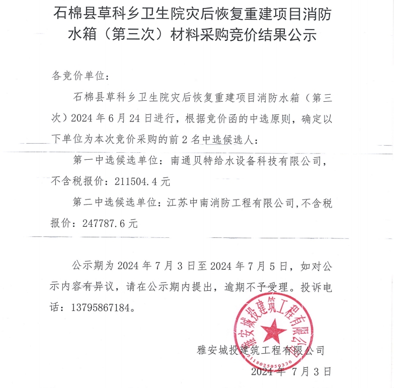石棉縣草科鄉(xiāng)衛(wèi)生院災后恢復重建項目消防水箱(第三次)材料采購競價結果公示