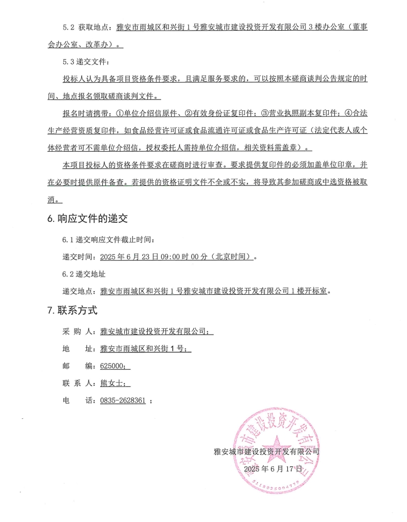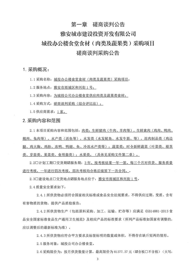 雅安城市建設(shè)投資開發(fā)有限公司城投辦公樓食堂食材(肉類及蔬果類)采購項(xiàng)目磋商談判采購公告