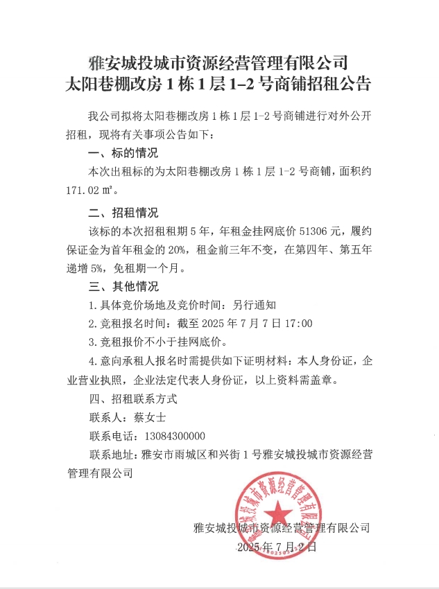 太陽巷棚改房1棟1層1-2號(hào)商鋪招租公告